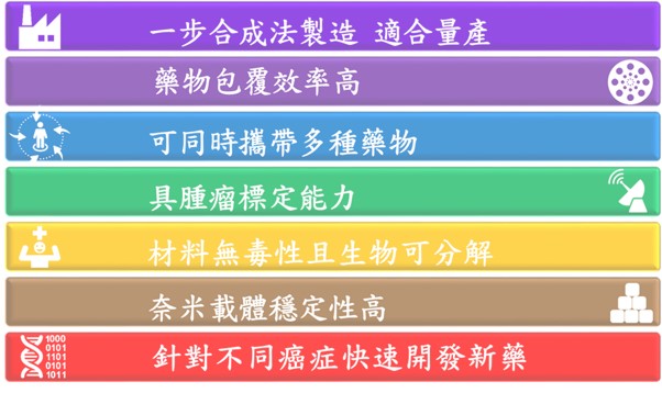 「模組化腫瘤靶向奈米藥物平台技術」的核心概念是透過模組化的設計,藉由更換不同的奈米顆粒、生物識別分子和治療藥物,如同拼積木的過程,開創各種型式的藥物組合,快速發展符合醫療需求的下一代奈米藥物。