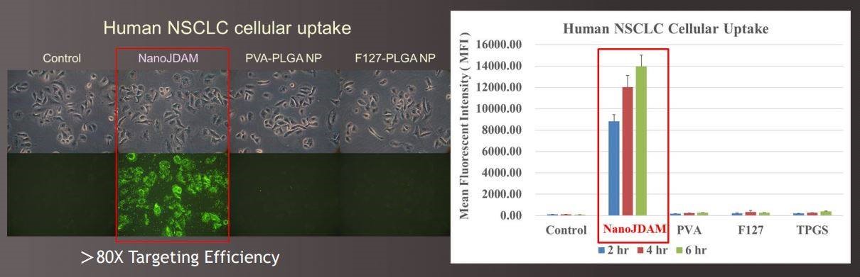 NanoJDAMTM 相較傳統製程奈米載體,具有數80-100倍的癌細胞親和力 (資料來源:奈威生技)